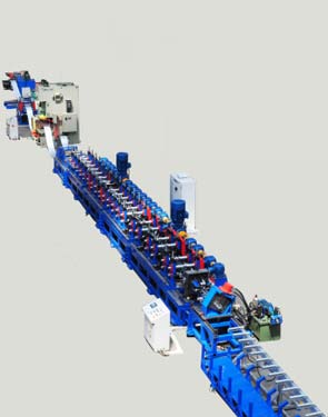 1.货架立柱冷弯型钢设备包括液压开卷、校平、送料、冲孔、成型、剪切、出料。控制采用西门子PLC,货架立柱生产线,触摸屏输入,自动化程度高、操作方便、生产效率高,整线生产速度可达到40m/min。