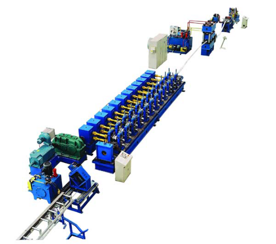 轻轨、地铁导轨不锈钢带冷弯生产线由开卷机、入料导正、校平机、切头机(对焊)、送料机、冲孔机、压印机、辊压成型机、成型剪、出料架、液压系统、电气控制系统组成,生产线速度:3-6m/min。