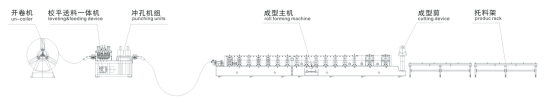开卷机---较平一体机---冲孔----成型机组----成型剪-----放料架
