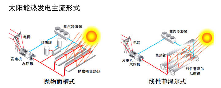 太阳能光热发电是指利用大规模阵列抛物或碟形镜面收集太阳热能,通过换热装置提供蒸汽,结合传统汽轮发电机的工艺,从而达到发电的目的。采用太阳能光热发电技术,避免了昂贵的硅晶光电转换工艺,可以大大降低太阳能发电的成本。而且,这种形式的太阳能利用还有一个其他形式的太阳能转换所无法比拟的优势,即太阳能所烧热的水可以储存在巨大的容器中,在太阳落山后几个小时仍然能够带动汽轮发电。
