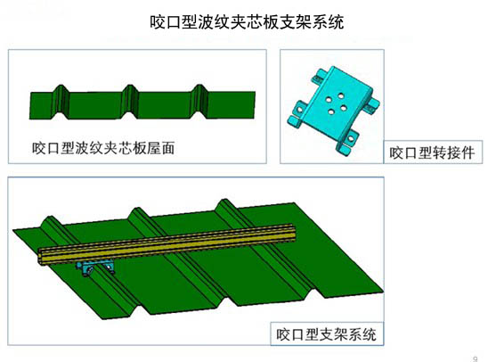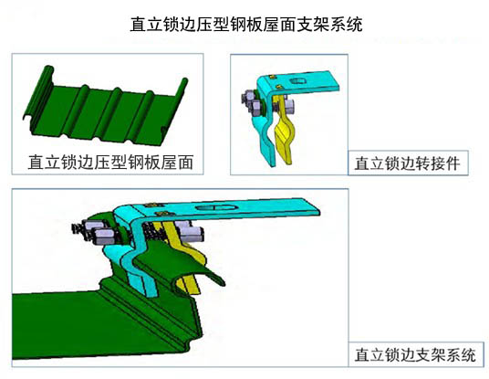 以上三种屋面支架系统,适合于厂房或仓库等大面积的彩钢瓦屋顶,采用铝制或不锈钢夹块将系统固定在屋面上。先进的设计,使整个系统的零件种类减到最少,安装简单快速。可用于安装任意规格太阳能多晶硅组件及薄膜组件。